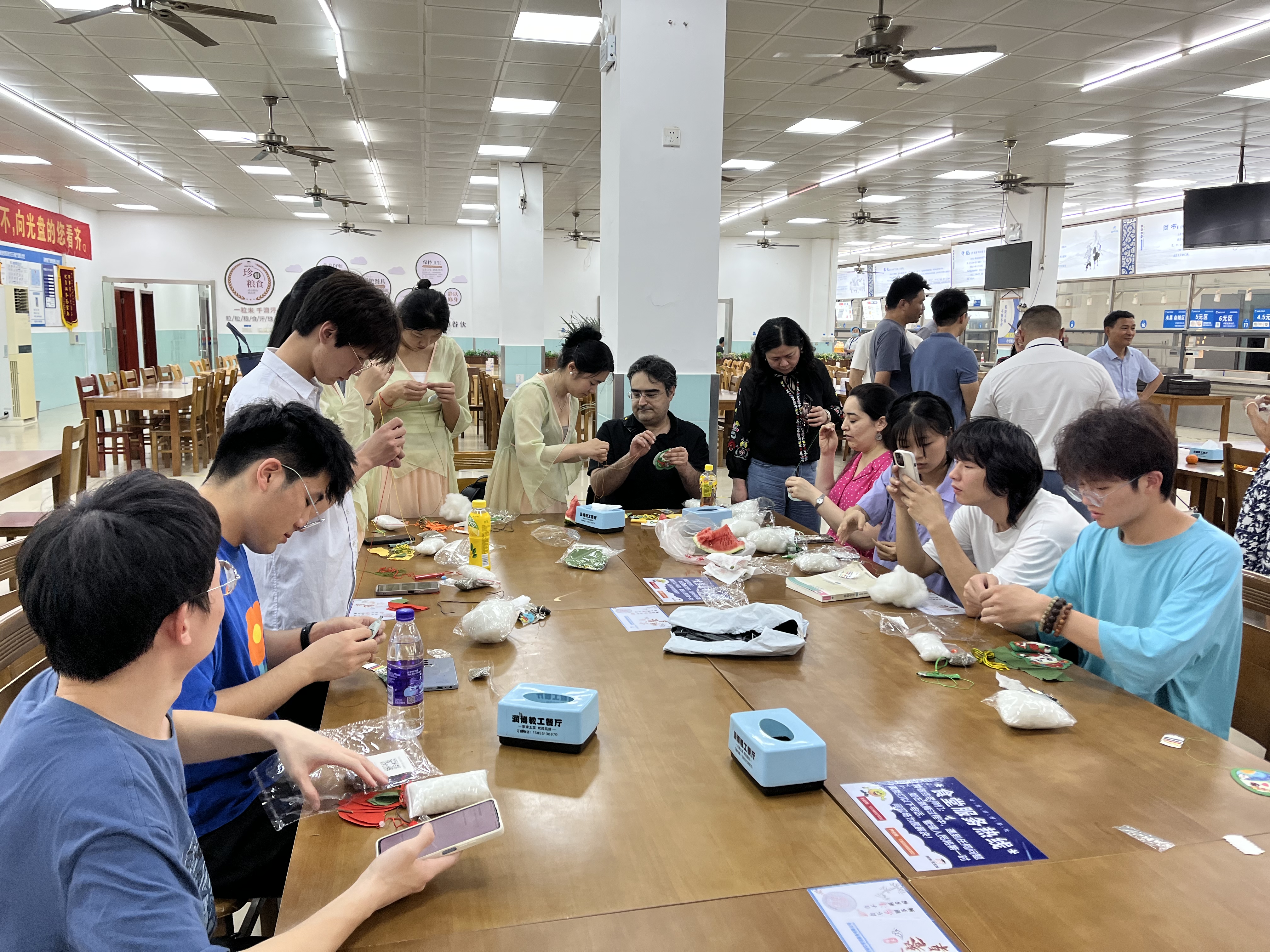 活动过程中与会人员首先观看了旅游管理专业同学们的茶艺表演,一杯杯香茗在四位身着汉服的同学手中经过置茶、冲泡、奉茶,让中外宾客品尝到了绿茶的清香、红茶的醇厚,对中华茶文化有了更深刻的体验和理解。接着,外教们在食堂师傅的指导下,一边饶有兴趣地用绿绿的粽叶包裹起粽子,一边聆听端午节习俗的文化来源。交流活动上,中外师生还一起学做传统挂件—香囊,在穿针引线之间,一个个散发不同香芬、秀气的香囊新鲜出炉,香气浓郁。