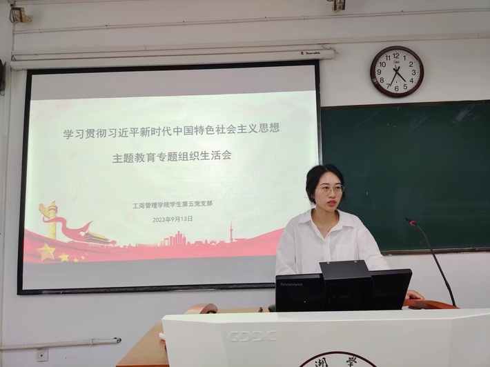 9月13日,工商管理学院学生第五党支部在博学楼310教室召开学习贯彻习近平新时代中国特色社会主义思想主题教育专题组织生活会。会议由党支部书记储岚霖主持,全体党员参与。