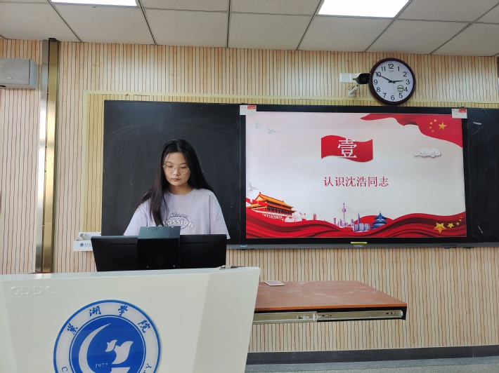 学生党员胡维敏分别从认识沈浩同志、沈浩同志伟大而平凡的一生和学习沈浩同志精神三个方面来向大家阐述了一位优秀共产党员、感动中国人物的光荣事迹。接着,她向大家简短地概括了沈浩同志的生平、成就。随后,她就沈浩同志与小岗村的不解之缘开始向大家详细介绍了沈浩同志伟大而平凡的一生。她说道,沈浩始终牢记“两个务必”,始终保持艰苦奋斗、清正廉洁的优良传统和政治本色。他不怕吃苦,不辞辛劳,带领小岗人民苦干实干,艰苦奋斗;他生活简朴,勤俭节约,从不讲究吃喝穿戴,一件羊毛衫穿得很旧,还舍不得扔掉;他严于律己,廉洁奉公,模范遵守党员干部廉洁自律的各项规定,不断健全村级各项规章制度,着力加强农村党风廉政建设。最后,她总结道,我们应该认真学习沈浩精神,要以沈浩同志为榜样,在平凡的工作岗位上刻苦学习、努力工作,勇于创新、乐于奉献,争取做出不平凡的业绩。