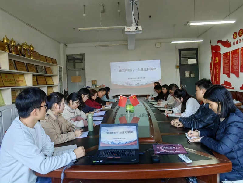 为深入学习贯彻党的二十大精神和习近平总书记关于加强新时代廉洁文化建设的系列重要论述,进一步引导党员教师牢记初心使命,坚定不移正风肃纪反腐,筑牢廉洁自律防线,11月22日上午,工商管理学院教工第三党支部在学院党员会议室召开“廉洁伴我行”主题党日活动,感受清廉文化,涵养师德正气。会议由教工第三党支部副书记郑玉玉主持,全体党员参会。