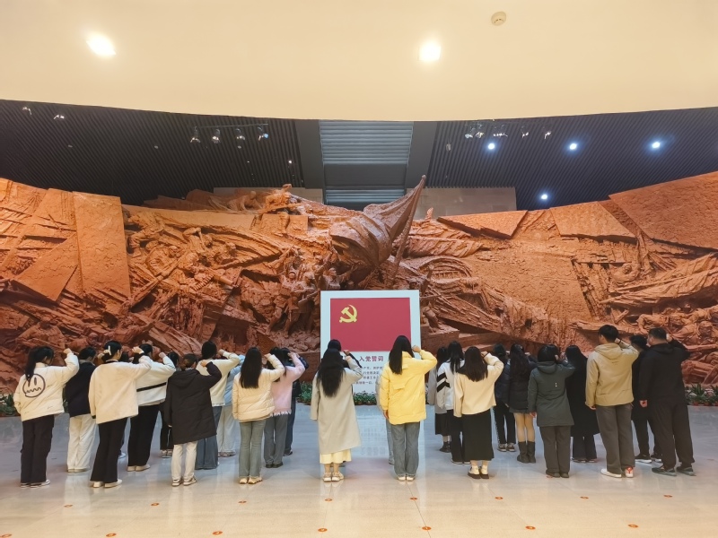 八百平方公里的巢湖水面上波光粼粼,位于安徽省合肥市滨湖新区的渡江战役纪念馆主场馆,犹如两艘乘风破浪的巨型战舰,面向巢湖,直指长江。来到渡江战役纪念馆,将全体师生视线拉回到74年前“钟山风雨起苍黄,百万雄师过大江”的激情岁月。在讲解员的带领下,同学们依次参观了“战前形势”“战役准备”“突破江防”“战役胜利”“人民支前”“英烈业绩”等六个主题展厅。“人民解放军百万大军,从一千余华里的战线上,冲破敌阵,横渡长江……”1949年4月22日,毛泽东亲自为新华社撰写消息《人民解放军百万大军横渡长江》,透过文字,学生党员依然可以感受到当年人民解放军锐不可当的气势。参观结束后,党支部的党员师生怀着崇高的敬意,面对党旗,重温入党誓词。