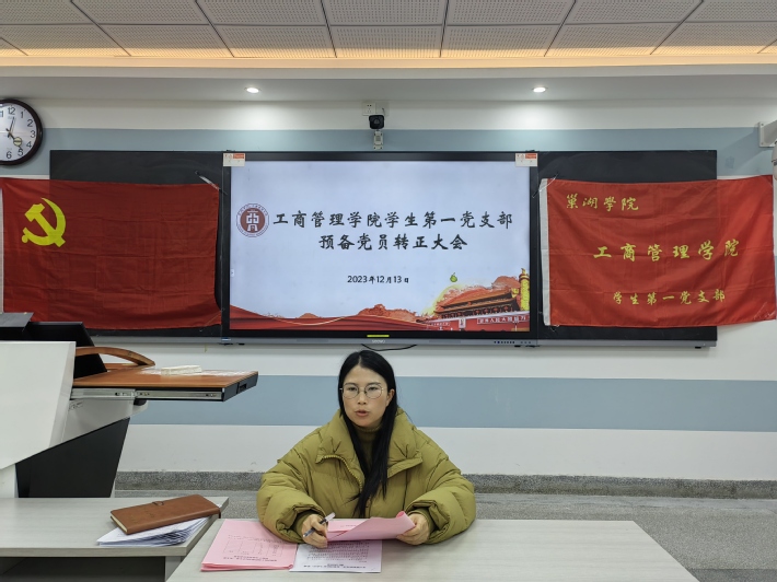 为保证党员质量,提高预备党员党性修养,加强党员队伍建设,工商管理学院学生第一党支部于12月13日中午在博学楼410召开预备党员接收暨预备党员转正大会。本次会议由工商管理学院学生第一党支部书记许沙主持,工商管理学院党委书记管超指导,学生第一党支部全体学生党员参加。