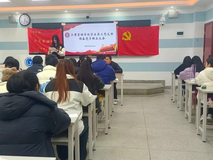 为严格落实党员发展流程,严肃预备党员期满转正工作,工商管理学院学生第三党支部于12月14日下午在博学楼410教室召开预备党员转正大会,会议进行了支部新党员发展决议。会议由支部书记刘国主持,支部全体成员参加本次会议。