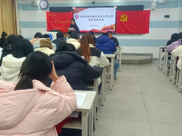为发挥党员的先锋模范作用,为支部增添新鲜血液,工商管理学院学生第三党支部于12月14日中午在博学楼410教室召开党员发展大会,会议进行了支部新党员发展决议。会议由支部书记刘国主持,全体支部委员出席,支部全体成员参加本次会议。