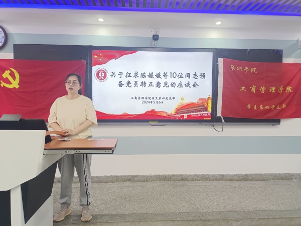 为提高党支部的凝聚力,加强组织建设,保证党员队伍的纯洁性,扩大党员队伍,工商管理学院学生第四党支部于5月6日下午在博学楼514教室召开党内外群众座谈会,本次会议由学生第四党支部书记任洁主持,主要听取党内外群众关于陈媛媛等10名预备党员是否转正的意见,支部相关学生党员和班级学生代表参会。