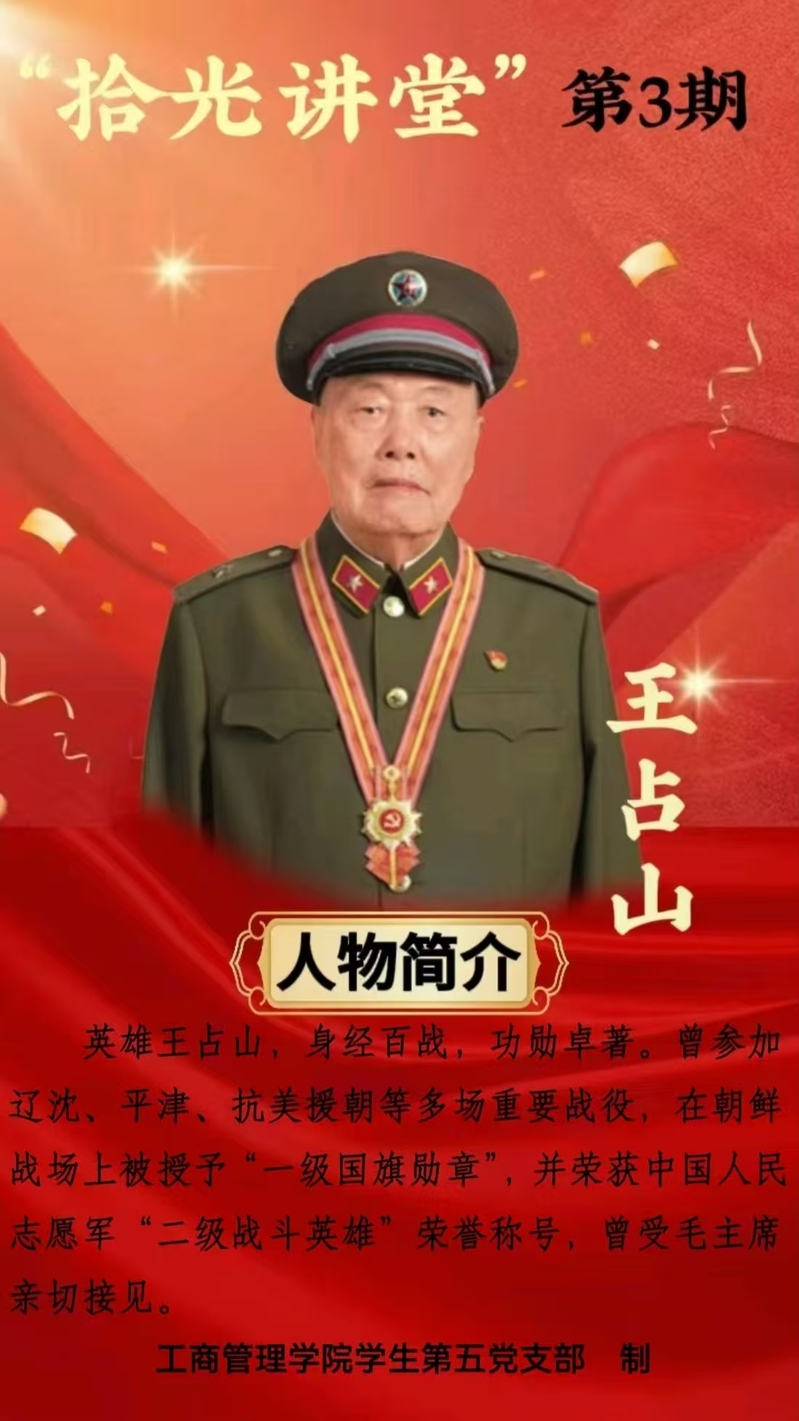 为深入学习优秀党员事迹,传承红色基因,工商管理学院学生第五党支部于10月17日中午在博学楼504开展“拾光讲堂”第三期特色沙龙活动,本期聚焦战斗英雄王占山同志,以“浴血疆场忠魂铸,丹心一片照山河”为主题,带领支部同志回溯英雄岁月,感悟信仰的力量。
