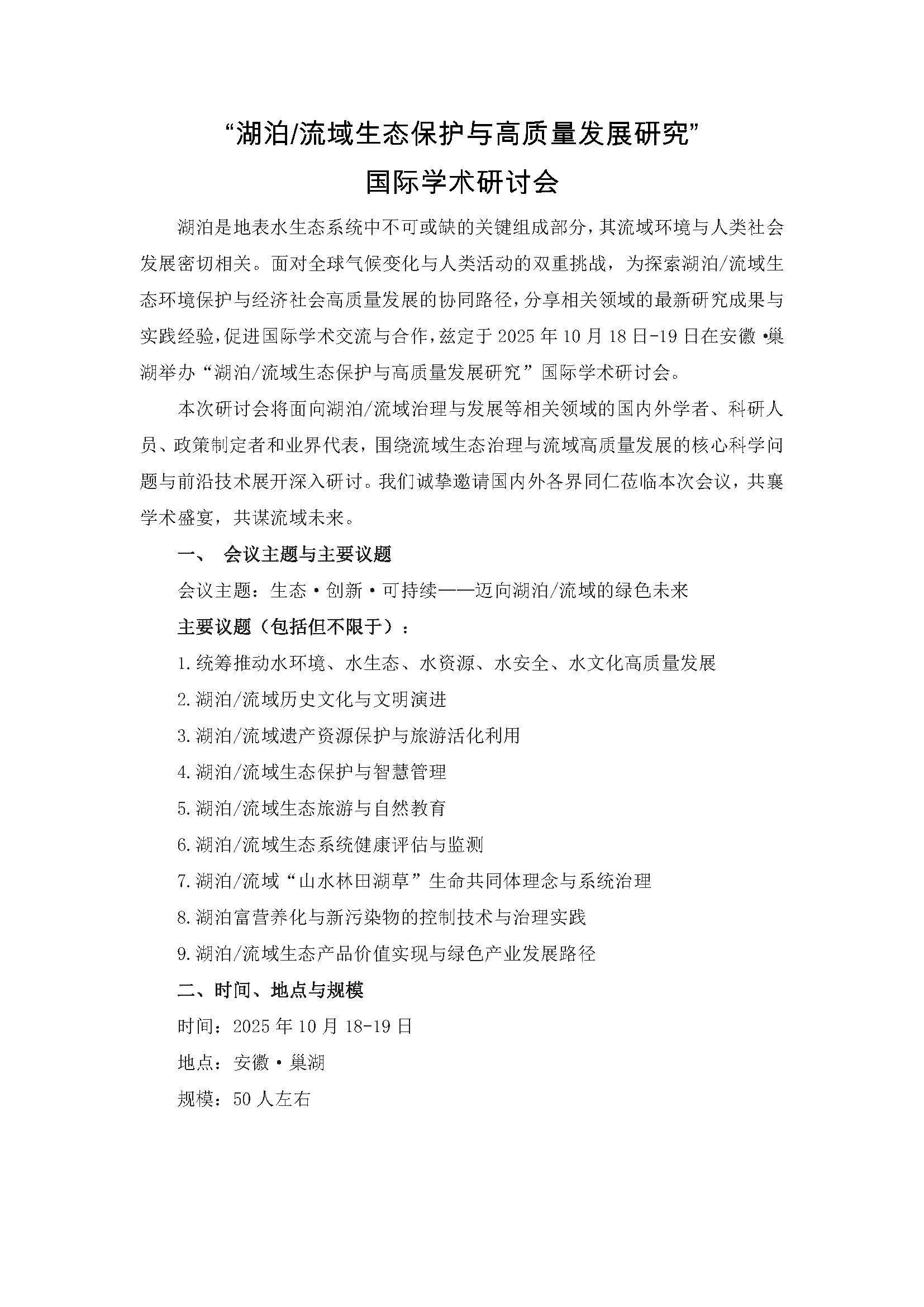 “湖泊/流域生态保护与高质量发展研究” 国际学术研讨会