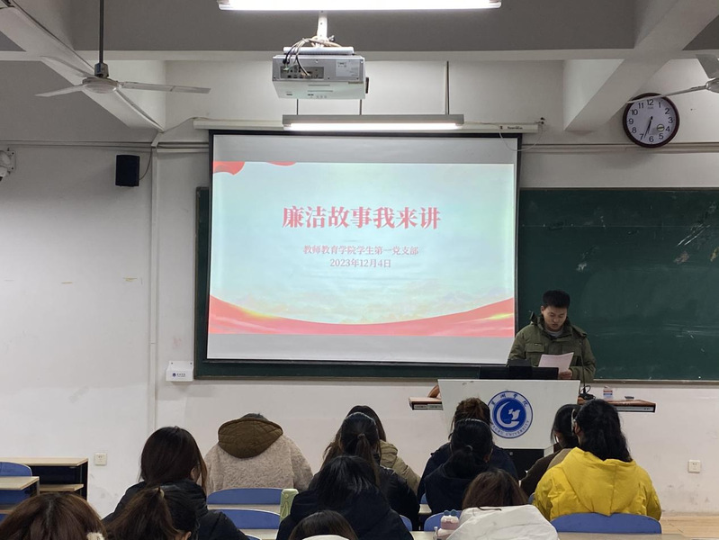 为深入推进全面从严治党,强化青年大学生党员廉洁自律意识,12月4日晚6:30,教师教育学院学生第一党支部在慎思楼中101教室开展“廉洁故事我来讲”主题党日活动。活动由支部书记王相主持。