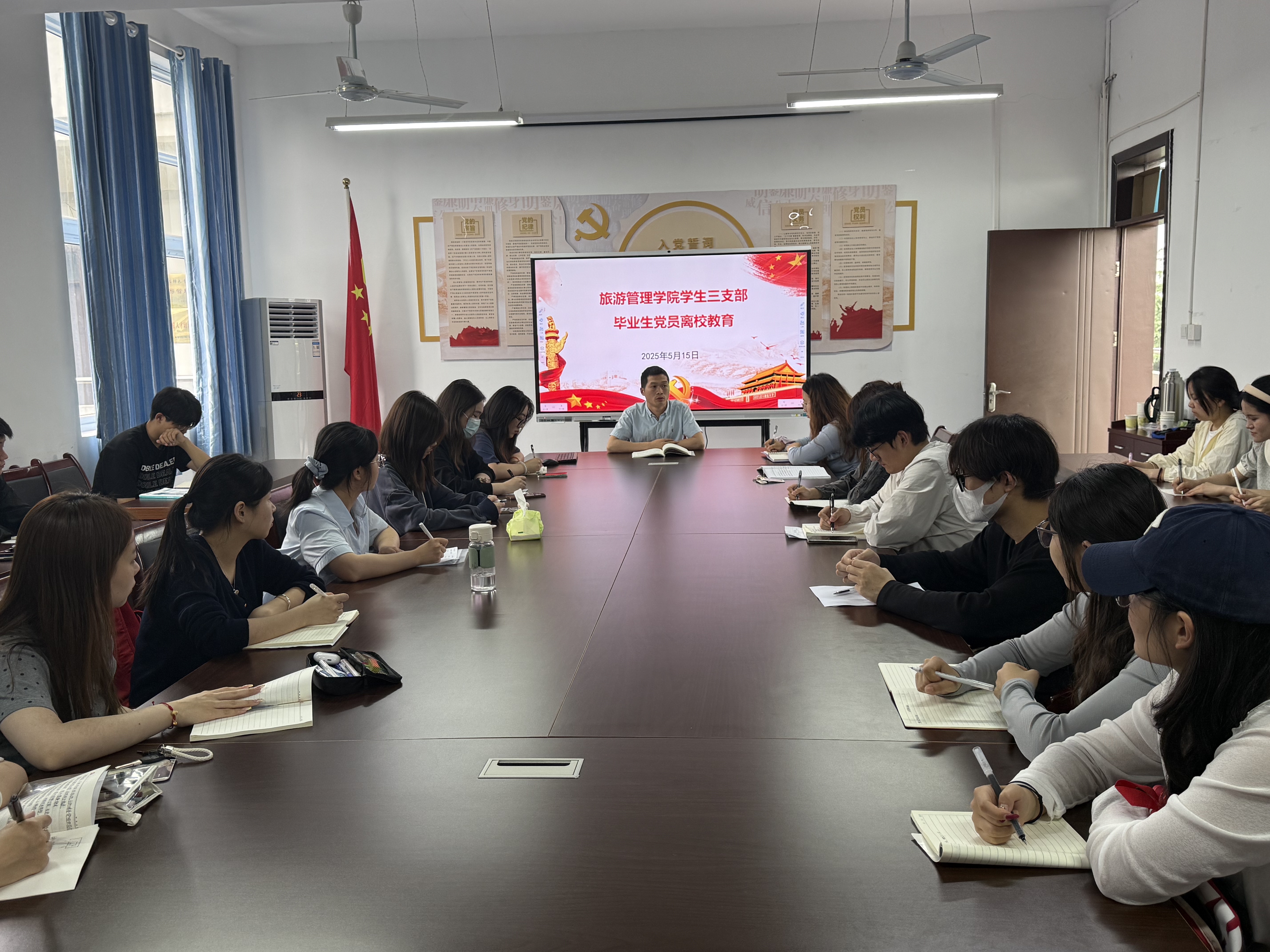为切实做好毕业生党员思想教育工作,进一步强化毕业生党员意识和党员身份教育,5月15日晚上,旅游管理学院党委学生第三党支部在明德楼会议室开展2025届毕业生党员离校教育,会议由支部书记曾鹏主持。