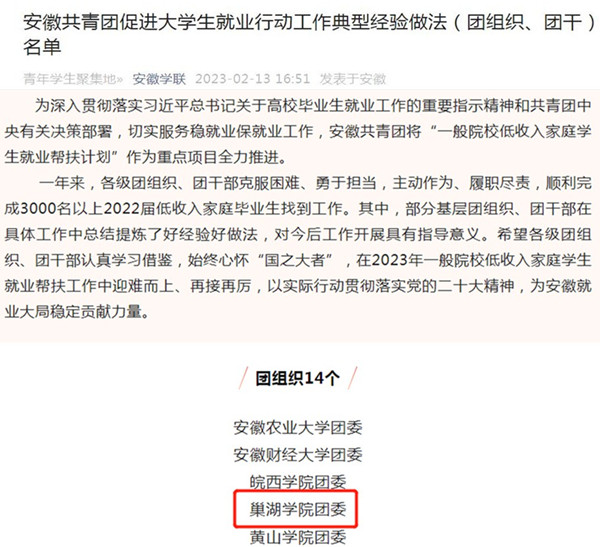 日前,安徽共青团促进大学生就业行动工作典型经验做法(团组织、团干)名单公布,新葡的京集团350vip8888官网团委荣获“安徽共青团促进大学生就业行动工作典型经验做法团组织”称号。