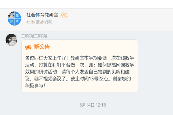 在新冠肺炎疫情影响下,体育学院社会体育教研室教师讲授的专业课程全部开通了网课,真正做到了应开尽开,停课不停学,停课不停教。由于是第一次大范围使用线上教学,很多教师也是第一次使用网络教学,对绝大多数老师来说,可谓“新生事物”。为了提高教师的网课教学水平,社会体育教研室于6月中旬在钉钉直播群开展了一场“如何提高网课教学效果”研讨活动,教研室所有授课教师都参与了此次研讨活动,研讨活动社会体育教研室主任兰顺领主持。