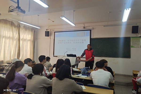 11月5日上午,苏家本老师在博学楼204教室为2019级社会体育指导与管理专业全体学生讲授了题为《涅槃重生:新冠疫情冲击下我国体育产业的困境、机遇与突围》的专题讲座。