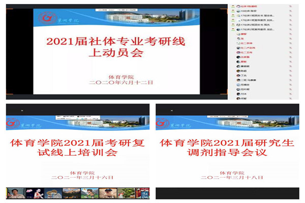 2021考研序幕拉开之前,体育教育教研室、社会体育教研室、大学体育教研室和管理岗老师们之间加强联合,强化服务育人理念,切实形成育人合力,组建了“考研智囊团”队伍。深入学生群体,从考研同学的需求抓起,精心组织,细化方案,多层次、多角度、多方位开展了考研服务工作。2020年4月至12月,全体辅导员持续召开了线上考研动员宣传系列会议;7月至12月,学院开展了多场师生交流会,芮德武、姚磊、赵胜国、蔡广、杨叶红、周雪华等多名教师就心理健康素质、学术基本功、考试流程、答题技巧等进行了多方面辅导;寒假期间老师们密切关注考研动态,通过电话、微信、QQ等方式了解考生考试情况,安抚情绪,做好下一步谋划,保证师生联络不断线;今年3月,学院领导和多名教授博士充分发挥他们的经验、阅历、人脉,点对点传授复试经验,做好调剂指导工作;4月学院召开了考研总结,总结经验,完善不足,为以后考研、考编、考公等工作明确路径,为促进就业工作奠定基础。