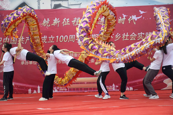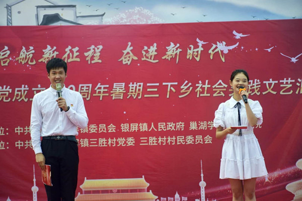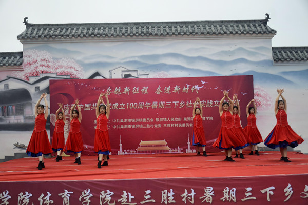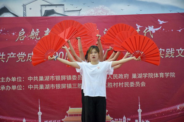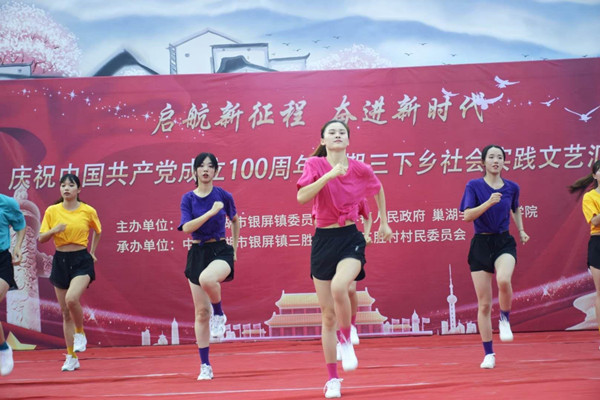 为庆祝中国共产党百年华诞,积极推进“我为群众办实事”实践活动走深走实,进一步深化服务乡村文化振兴建设,做好做实“三全育人”工作,强化党组织对青年学生的凝聚力与感召力,7月6日晚,体育学院党委联合中共巢湖市银屏镇委员会、银屏镇人民政府,在银屏镇三胜村文化中心广场共同组织开展了主题为“奋斗百年路 启航新征程”庆祝中国共产党成立100周年文艺演出活动,体育学院部分教师及学生党员、团员青年共计百余名参与本次演出。