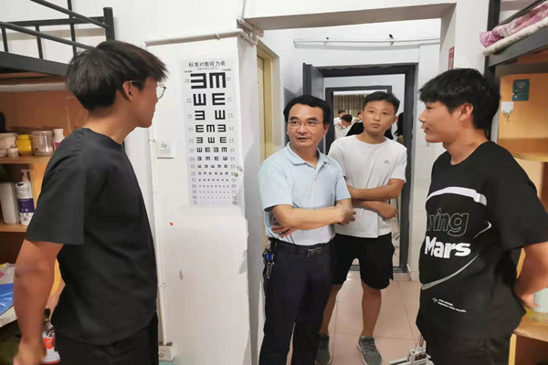 为进一步做好新生入学教育工作,了解我院新生住宿和生活情况,引领新生尽快适应新生活新环境,9月12日晚上,体育学院党委书记芮德武带领辅导员张巧生、杜锐等人走访学院新生寝室,关心慰问刚入学的21级新生。