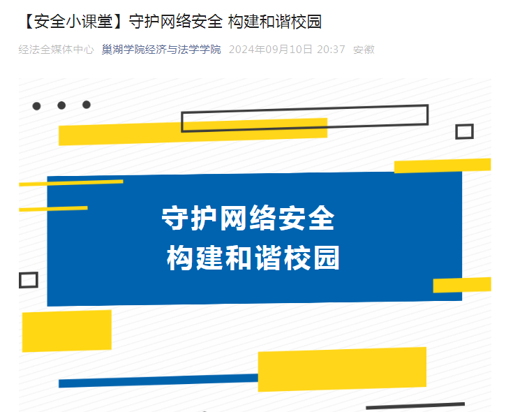 为扩大宣传覆盖面,学院充分利用易班工作站,在“两微一端”等新媒体传播平台,发布题为:【安全小课堂】守护网络安全 构建和谐校园的推文。推文从什么是网络安全、网络安全相关法律、网络陷阱知多少和网络安全技能等方面普及网络安全知识,引导师生关注网络安全,积极参与网络安全建设,协力营造清朗网络环境,共同维护网络空间的安全和稳定。