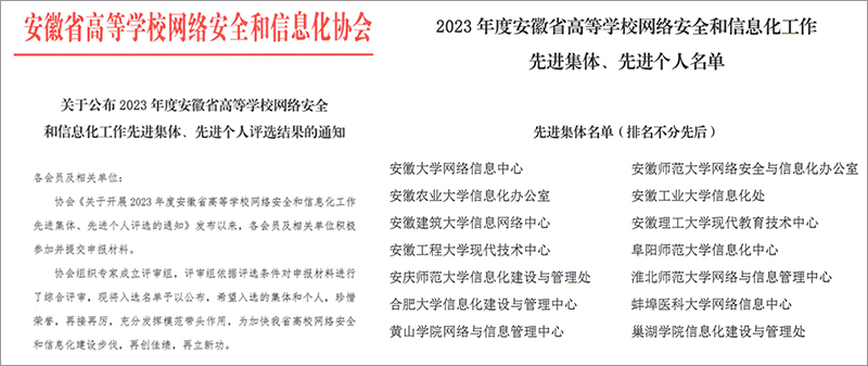 近日,安徽省高等学校网络安全和信息化协会下发《关于公布2023年度安徽省高等学校网络安全和信息化工作先进集体、先进个人评选结果的通知》,新葡的京集团350vip8888官网荣获“2023年度安徽省高等学校网络安全和信息化工作先进集体”。