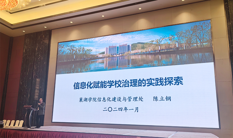 2024年1月6日,安徽省教育和科研计算机网2023年学术年会在安徽省亳州市举行。会议由安徽省教育和科研计算机网网络中心主办,云集了来自全省83所高校的220多名参会代表。会议围绕“深入推进安徽高校数字化建设”展开深入交流和探讨。作为信息化工作成绩突出单位代表,学校信息化处处长陈立钢受邀作题为“信息化赋能学校治理的实践探索”的经验分享报告,从推进数据治理、提升业务联动、丰富服务应用、推动多网融合、构筑网络思政平台等五个方面介绍了相关举措和成效。