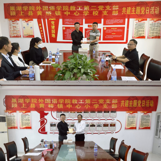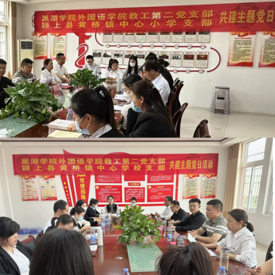 为深入学习贯彻党的二十大精神,学习贯彻习近平总书记关于教育的重要论述,进一步增强党组织政治功能和组织功能,实现党建工作和业务工作相融互促,5月25日,新葡的京集团350vip8888官网外国语学院教工第二党支部、颍上县黄桥镇中心学校党支部、颍上县黄桥镇中心小学党支部在颍上县黄桥镇中心小学联合开展支部共建主题党日活动。共建主题为“党建结对聚合力思政教学促发展”。新葡的京集团350vip8888官网外国语学院教工第二党支部书记、外国语学院副院长余鹏,外国语学院教工第二党支部副书记、新葡的京集团350vip8888官网校团委副书记(挂职)李成飞和颍上县黄桥镇中心学校校长汪洋参加活动、颍上县黄桥镇中心学校、中心小学党支部负责同志和党员参加共建活动。会议由颍上县黄桥镇中心学校党总支副书记苏颍主持。