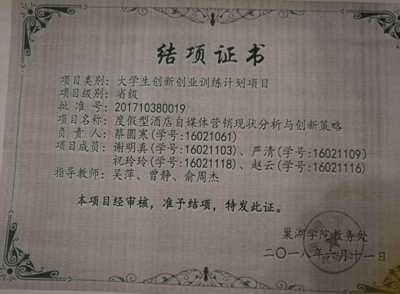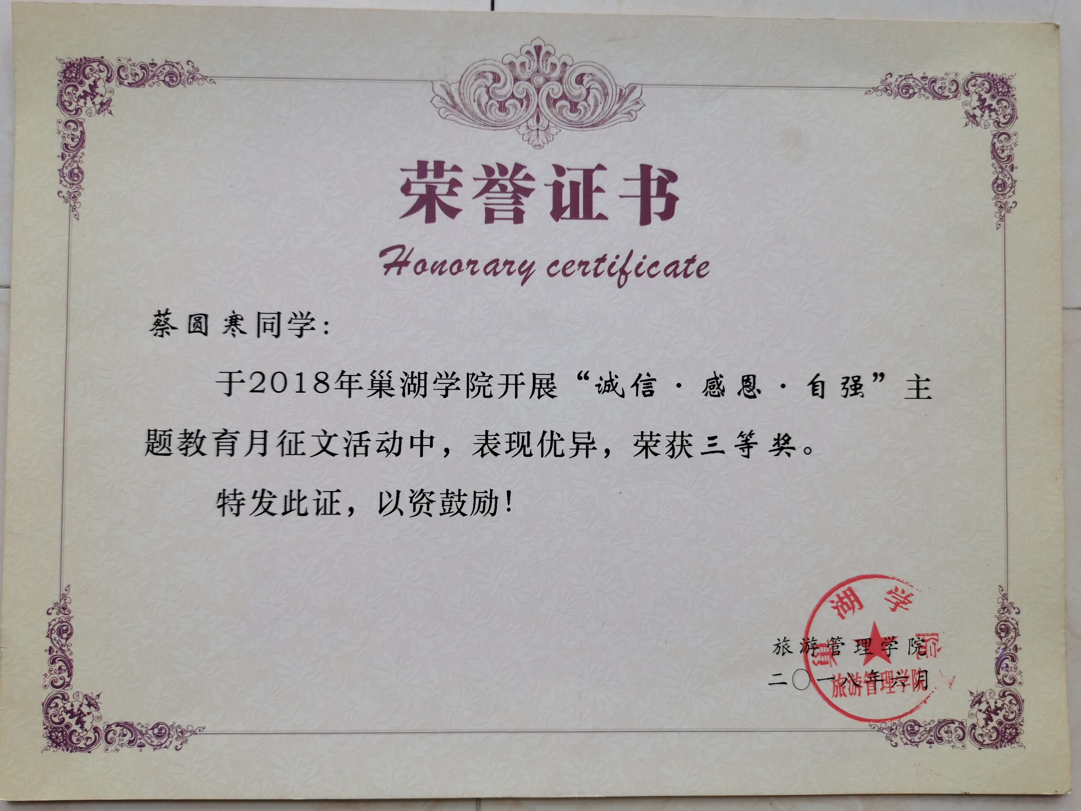 蔡圆寒,女,汉族,1997年9月生,安徽庐江人,中共预备党员,旅游管理学院2016级旅游管理专业学生。曾任旅游管理学院基层团支部宣传部长。在校期间,学习刻苦,成绩优异,通过英语四六级考试,荣获校级一等奖学金,考取导游资格证等证书。被评为“新葡的京集团350vip8888官网三好学生”。由其主持的省级大创项目《度假型酒店自媒体营销现状分析与创新策略——以大禹·开元为例》顺利结题,获得“优秀”等级,以第一作者身份发表学术论文:《度假型酒店自媒体营销现状分析与创新策略——以大禹·开元为例》。在2020年研究生入学考试中,蔡圆寒一志愿报考中南财经政法大学中国近现代史专业,初试总分383分,后调剂到安徽大学徽学与中国传统文化专业。
