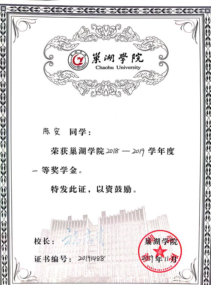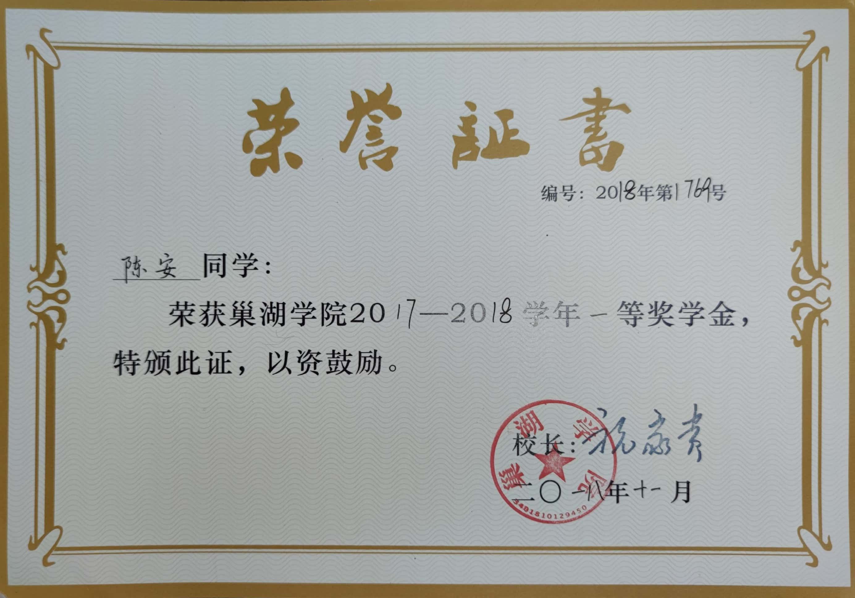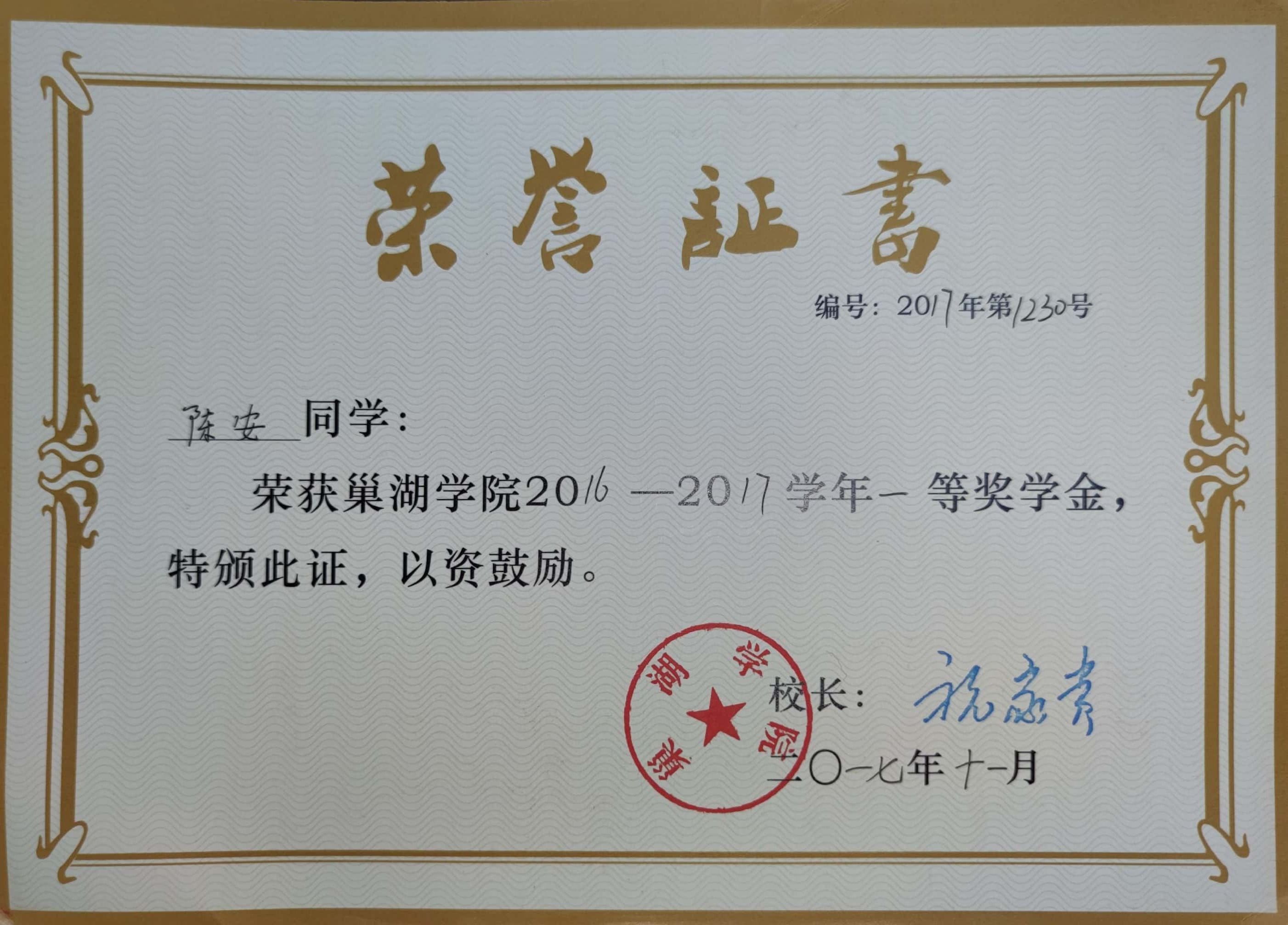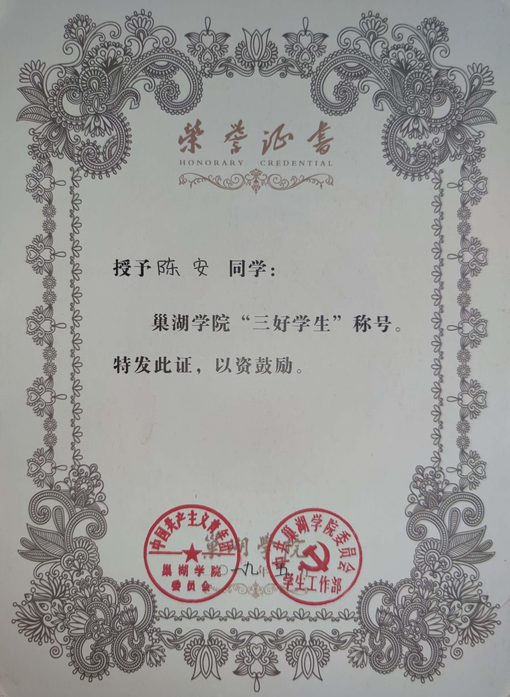 临毕业时,陈安凭借优异的学习成绩、出色的日常表现、积极向上的品质,经过层层选拔,被评为省级“品学兼优毕业生”,这是对他四年来勤奋学习、默默奉献、担当作为的肯定,也为他丰富多彩、青春激扬的大学生活画上一个圆满的句号。闪亮的瞬间背后,是无数默默耕耘的日子,回顾大学四年,他说:“我最大的感触是只要勤奋付出,持之以恒,必将有所收获,借用自己最喜欢的曾国藩的名言,就是‘莫问收获,只问耕耘’,感谢巢院给我提供了这块耕耘的土地”。